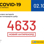 На сегодняшний день в Украине зарегистрировано рекордное количество новых случаев заражения коронавирусом за сутки с начала пандемии в стране. Их – 4633, а это на 564 больше, чем вчера. Выздоровели и выписаны из больниц 2193 человека. В Центр общественного здоровья поступило 4856 сообщений о подозрении на коронавирус. Об этом сообщает Министерство охраны здоровья Украины. По состоянию на 9.00 утра 2 октября в стране насчитывается 217 661 лабораторно подтвержденный случай COVID-19. Заболевание унесло жизни 4261 пациента. 96591 человек выздоровел. С подозрениями на коронавирус обратились 284 500 людей. Статистика заболеваемости COVID-19 по…