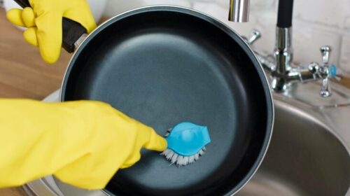 Беремо чверть великої цибулі і кладемо прямо на сковорідку.Додаємо ¼ склянки оцту.Ставимо на плиту і доводимо до кипіння.Даємо цій суміші прокипіти 10 хвилин.Чому це працює? Ферменти, які містяться в цибулі, розм’якшують навіть найстаріший нагар, а оцет розчиняє жир і неприємні запахи. До речі, цей спосіб ще й відмінно дезінфікує посуд.