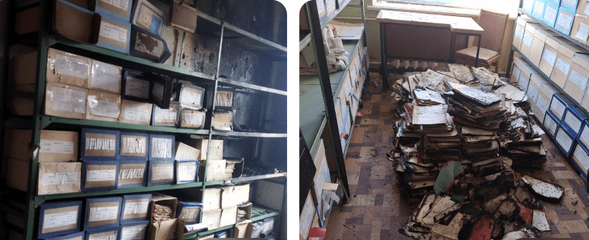 "Рівень збитків та втрат документів в процесі оцінки продемонстровано на фото. Люди не постраждали. Попередньо зруйновано близько 10% архівної колекції – близько 1 тис. архівних справ", – написав Хромов.