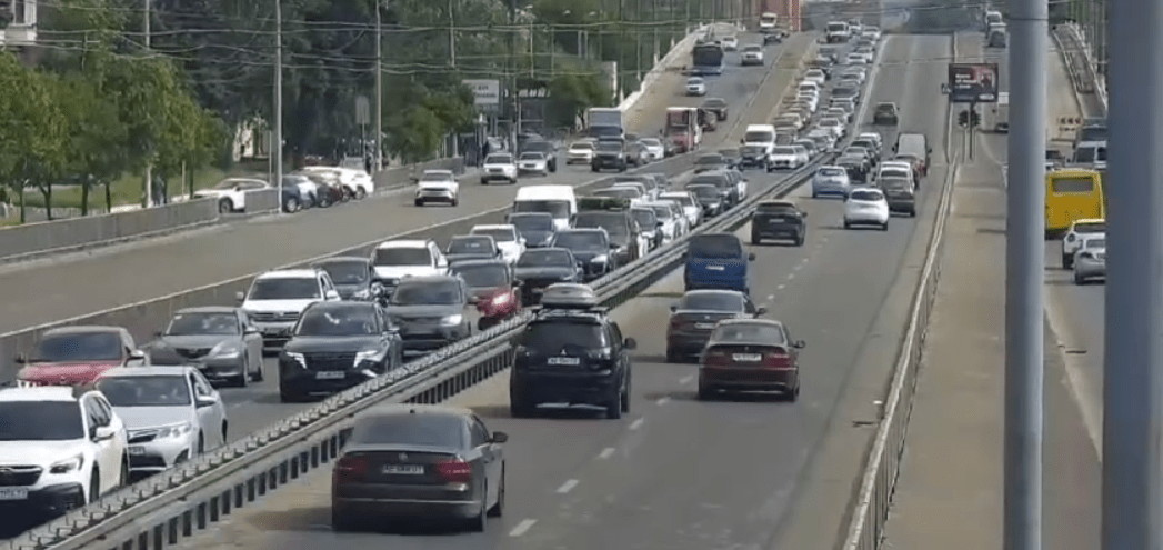 У зв'язку із ДТП двох автівок, виник затор в бік правого берега. В лівій смузі проспекту транспорт просто стоїть колоною.