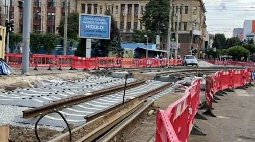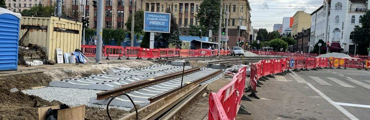 У центрі Дніпра замість старої колії монтують нову. На локації працює спецтехніка, а будівельний майданчик захищено червоними бар’єрами.