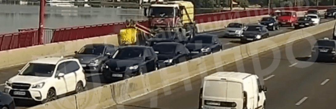 Дорогою з лівого на правий берег зіштовхнулися легковики. Вони "не вписалися" біля габаритної комунальної автівки, яка чистила узбіччя дороги. Тепер рух в напрямку центру ускладнено ще більше.